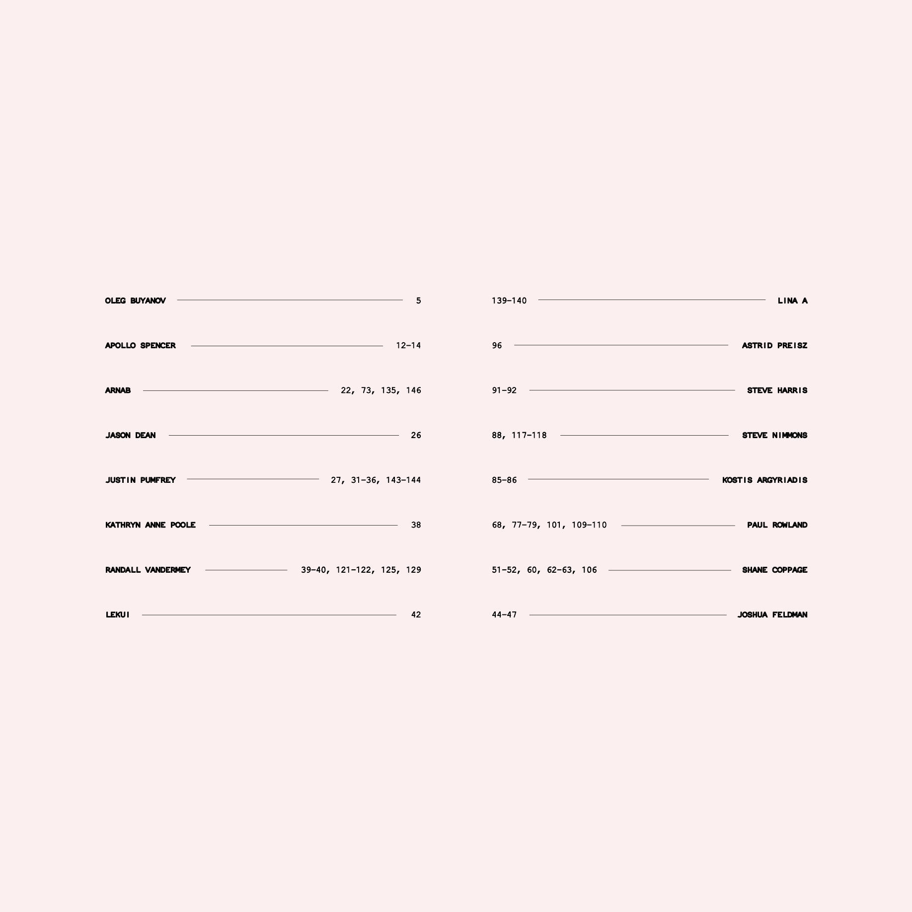 Alina Aminova, Almond Pothole, Amer Rust, Amy Aiken, Amy Newton-McConnel, Astrid Preisz, Barb Kreutter, Cam Crosland, Chris Wenger, Dan Baumbach, Daria Panichas, Darnia Hobson, Diewke van den Heuvel, Forties UK, Gianluca Mortarotti, Hartmut Rieg, Ilmari Hietala, James Brouwer, Jasmin Javon, Jason Dean, Jean Paul Soujol Benedetti, Jeff Tung, Jeremy Westgate, John Wilkinson, Joshua Feldman, Justin Pumfrey, Karin Wegmann, Kathryn Anne Poole, Koen Vanacker, Kostis Argyriadis, Lekui, Lina A., Maja Strgar Kurečić, Maryna Kostiukevych, Matthew Fertel, Muriel Gani, Oleg Buyanov, Paul Rowland, Qiyao Lin, Shar Marie, Steve Harris, Susan Bowen, Suzanne Livingstone, Tristan Morin, and Wendy Kappy.